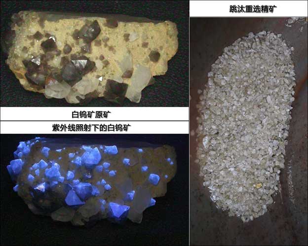 下圖是一組粗粒嵌布的白鎢礦的圖片,左上圖為原礦石圖片,左下圖為紫外線照射下的白鎢礦圖片(紫外線照射下可以看到明顯的白鎢礦結(jié)晶體),右圖是利用跳汰機重選獲得的白鎢礦精礦。